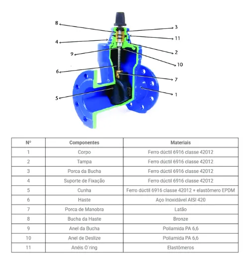 Entre suas principais vantagens estão a passagem plena, que evita acúmulo de resíduos e obstruções, e o sistema de vedação eficiente que permite manutenção com a rede pressurizada. A haste em peça única, o baixo torque de manobra e a estanqueidade em ambos os sentidos de fluxo garantem uma operação segura e durável. O modelo tem diâmetro DN 150 e segue a norma de fabricação NBR 14968.